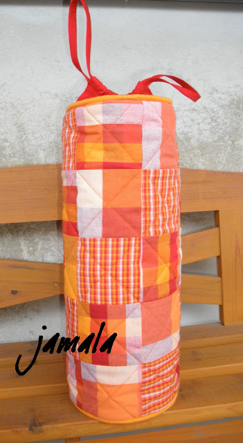 základ tvoří čtverce vel. 8,5 cm sešité do obdélníku 6 ks na šířku válce a 5 ks na výšku. Vyztužila jsem termolínem 180. Sešila jsem do tvaru válce. Na horní obou koncích jsem lemovala paspulkou vyztuženou tužší šňůrkou (knot) pro udržení tvaru. Našívala jsem zipovou patkou s jehlou posunutou do kraje.