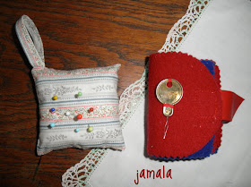 Abych ukázala, že obojí není jen zálibou poslední doby představím dva kousky, které používám. Ten maličký je docela mladý, mám jej z loňského výletu do Švýcarska za šitím na panenky do muzea. Látka je z Ameriky, 19 století. Vycpala jsem jej zbytky vatelínu ze kterého jsem tam šila zavinovačky pro panenky. Je vycpaný jen malinko, ale nechtěla jsem jej upravovat. Ten druhý je jehelníček, můj "spotřebák", který mám už asi 10 let a slouží k ukládání jehel. Spíchla jsem ho jen tak narychlo mezi nějakým šitím ze zbytků flauše.