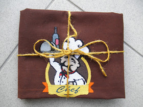 S oblibou dělám některé věci na poslední chvíli. Vždycky si říkám, že to prostě musím zvládnout. A taky když mám čas,  nic mne nenapadne. Koupila jsem synovi k narozeninám jeho vysněný poukaz do sýrárny a další dárek - plastový model nějaké vojenské techniky si raději vybral sám. A protože si už tak nějak zvykl na "měkké" dárky, musela jsem nějaký vymyslet. Rád griluje a tak jsem se rozhodla ušít zástěru. Dám tam něco vyšívat, mezitím upeču oblíbený dort... Nově jsem koupila sadu vyšívacích nití, našla parádní free výšivku a vyšívala. Jenže moc tenká jehla mi samozřejmě trhala nitě a tak 56 minut vyšívání se protáhlo na tři hodiny. Musím si koupit lupu, abych přečetla velikost jehly! Celý den jsem šila zástěru a pytlíček na dárkový poukaz. Dodělala jsem i dort a mohlo se slavit a grilovat.