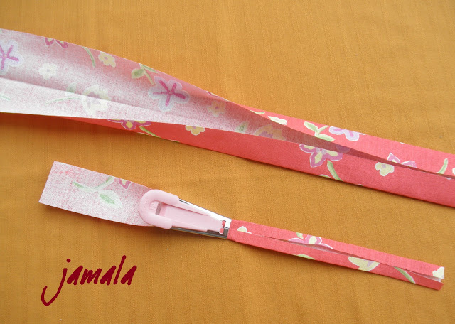 Ucho sežehlín na polovinu, abych si označila střed a pak žehlím každou stranu k tomuto středu. Na poutko používám zakladač.