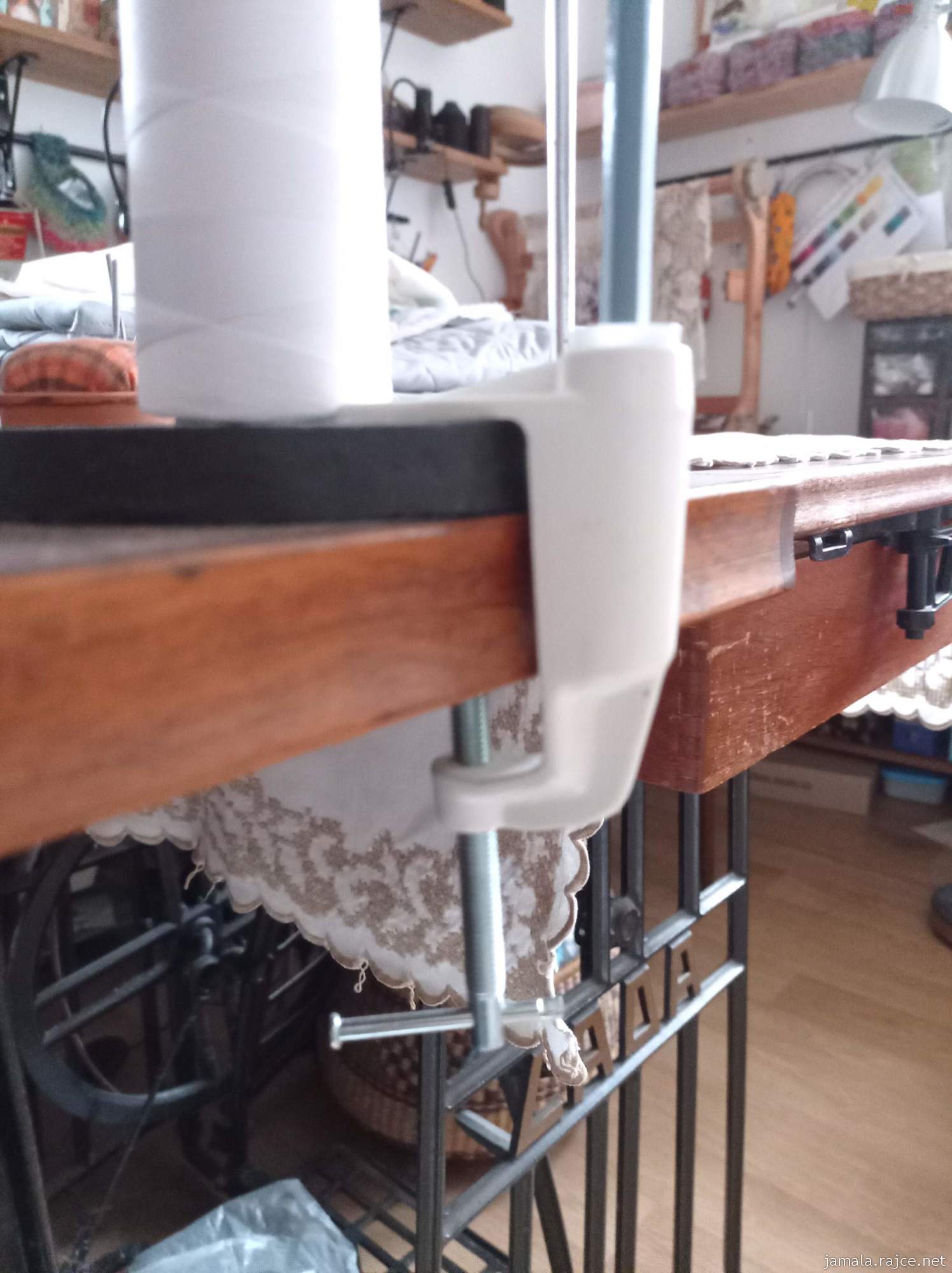 Jako nepotřebné měly být vyhozené tyhle držáky na lampu. Někdy je lampa na stůl a k tomu jsou jako druhá volba i tyto držáky k přišroubování. Používám k uchycení stojánku na nitě, do otvoru jde odložit tužku nebo prostě jen klacík. Na něj pak dám klubko nebo lemovací proužek a odvíjím. Já je ještě používám na vozík na rámu jako brzdu vozíku.