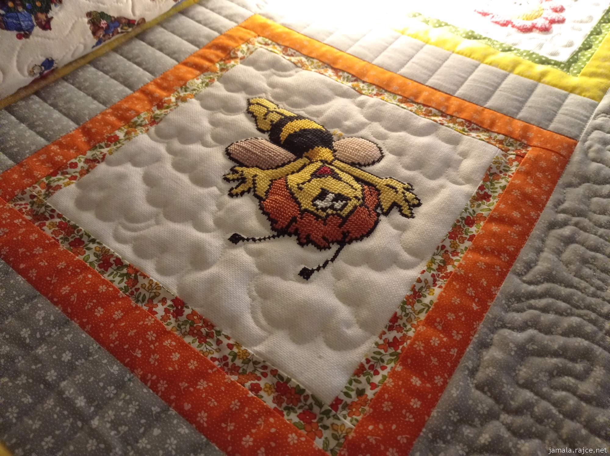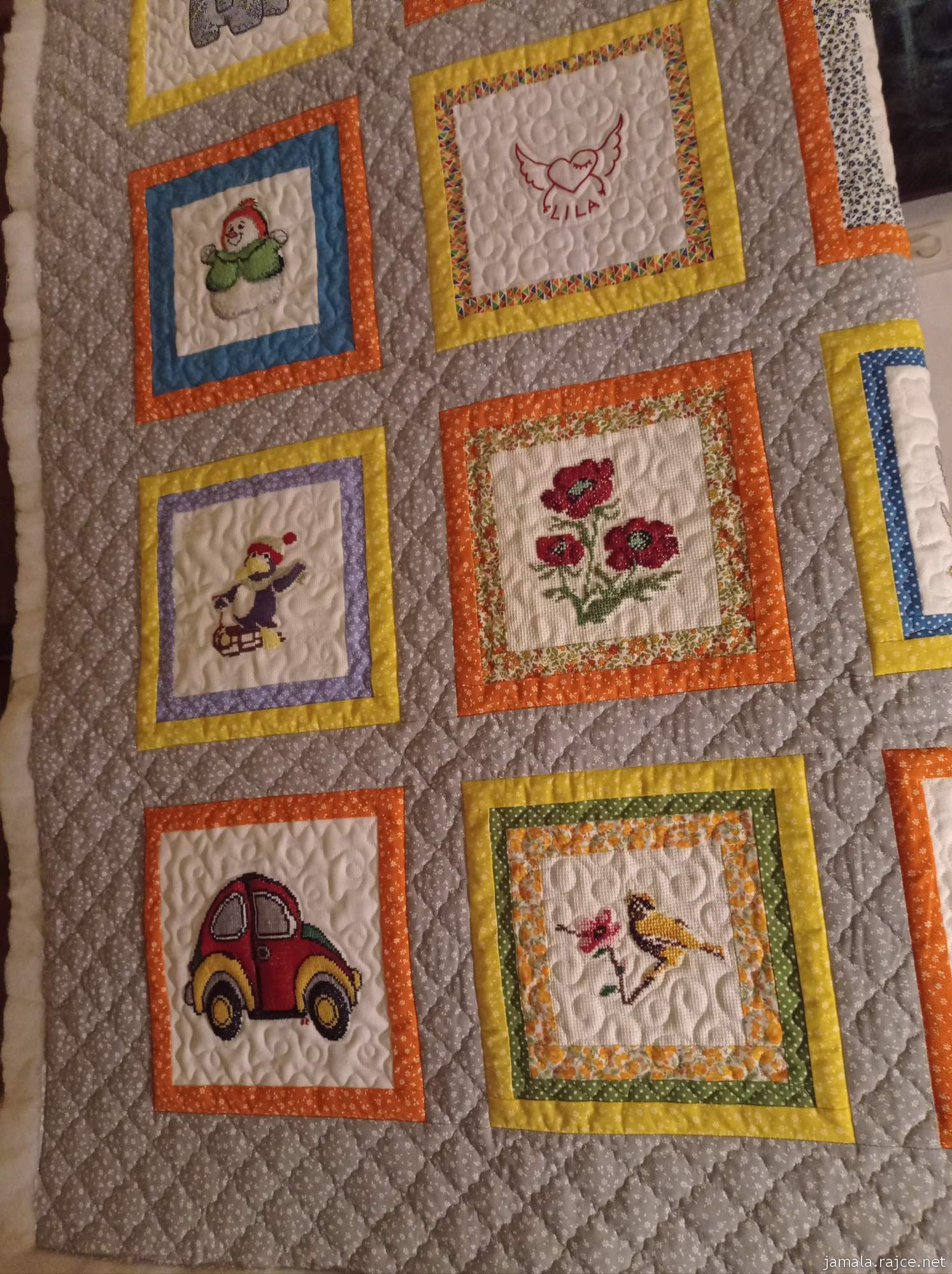 Dnes ukážu nějaké prošívání z poslední doby. Deky jsem tedy nešila já, ale jen prošívala. Jsou to dětské deky a obrázkové jsou pro domov LILA v Otnicích a jednu dětskou jsem prošívala pro kamarádku. Všechny deky byly prošívané na rámu, ale na modré dece ukážu jak by šla prošít pod strojem s kráčející patkou. Když píšu o rámu, nemám longarm. Pokud se dá vůbec hovořit o rámu, tak v porovnání s rámem Bernina, který se tady kdysi prodával, tak můj rám je starý, hodně ojetý trabant oproti Ferrari. Prošití deky mi trvá docela dlouho a někdy je dost pracné.