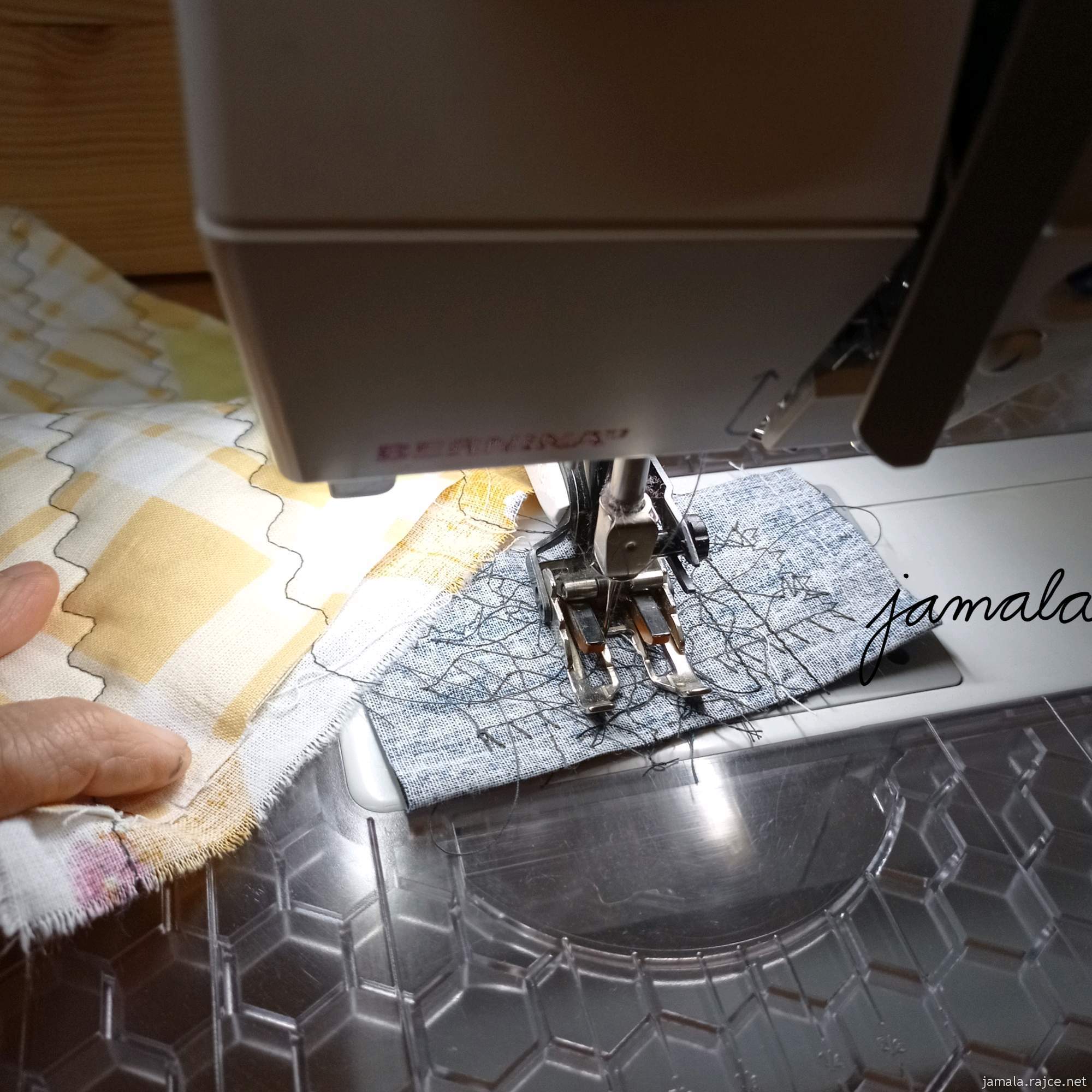 Vzor na dece jsem dělala volným quiltováním, ale připravila jsem ukázku takového prošívání s kráčející patkou. Vlnky jsem šila na Bernině Auroře stehem 4, ale i jiné stroje tento nebo podobný steh mají.