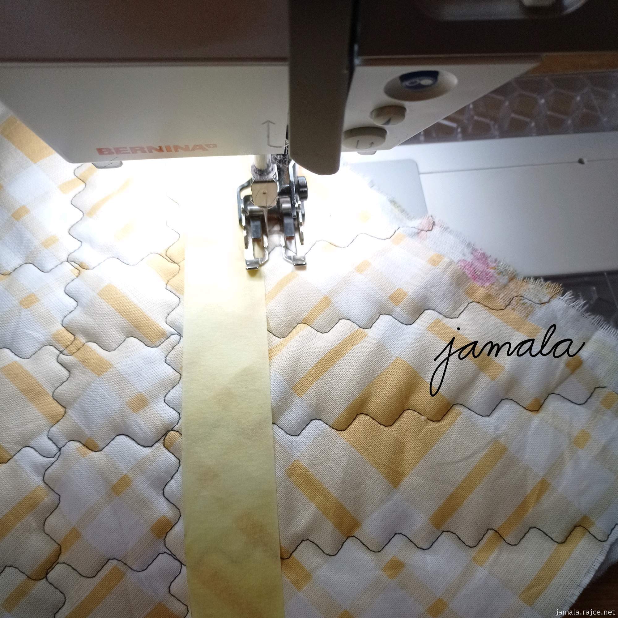 Dva tipy: Na konci šití nestříhám nit, ale používám kousek látky přes který přejedu a nemusím pokaždé stříhat. Já vím, jsou dnes stroje s odstřihem, ale můj stroj ho nemá a i kdyby měl, tak ho nerada používám. Druhým tipem je značení malířskou krycí páskou, díky kterému jsem měla vzorek prošitý rychle bez kreslení pomocných čar.
