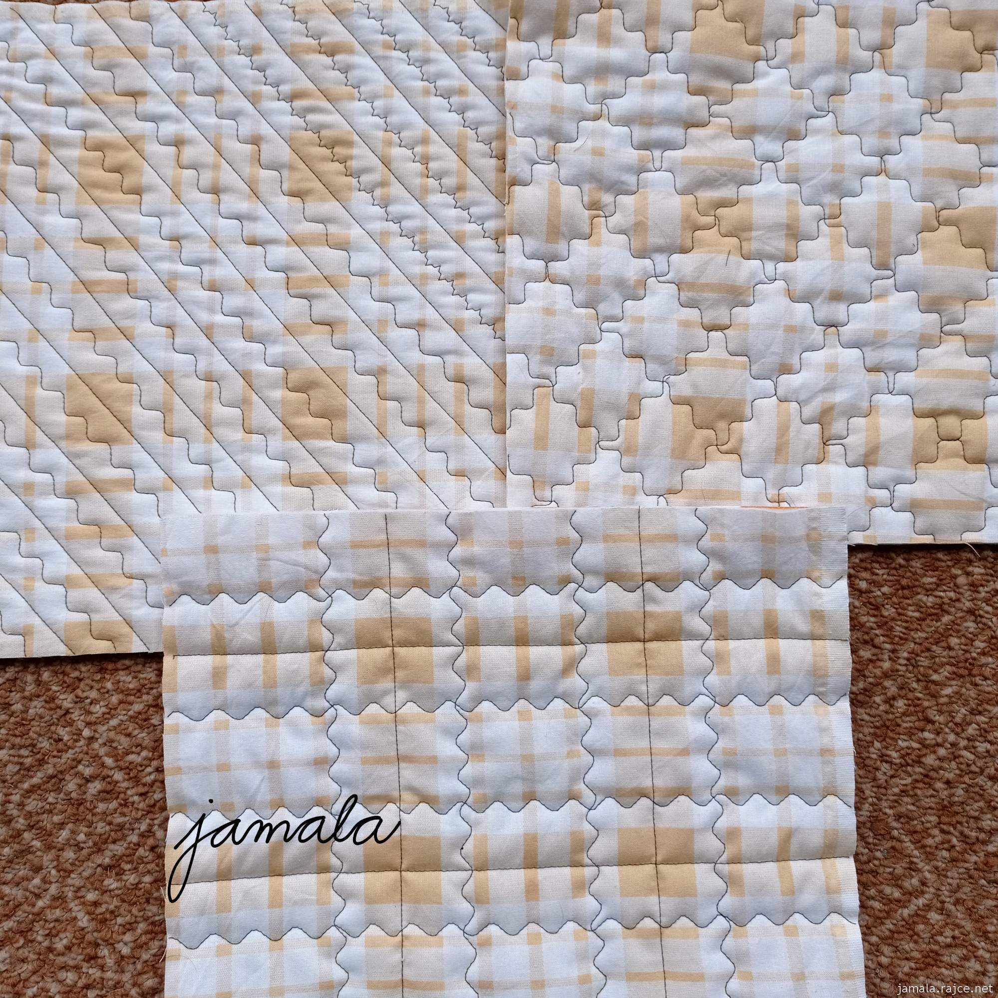 Kombinace rovného prošití a vlnek je další varianta. V diagonále nebo ve vzoru sashingu a kolem něj (u mne károvaný vzor). Pokud bych měla ještě borduru, tak vzor vlnek bych protáhla u vzoru se sashingem až do bordury. Zvolila jsem kontrastní nit, deku bych prošívala něčím méně nápadným.