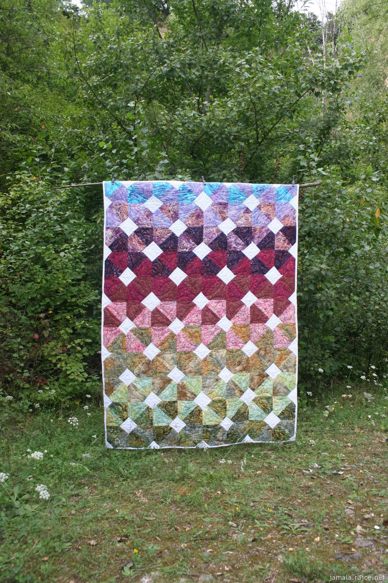 Poslední roky vždy na Silvestra začínám šití nějaké deky. Většinou je to nějaký volně přístupný návod, ale šití posledního dne roku 2020 jsem pojala jinak. Dostala jsem na vánoce knihu Hra barev od Jitky Chumchalové a bylo jasné, co budu šít. Kdysi jsem si přála na narozeniny Bali batiky a neměla jsem moc chuť a odvahu do nich říznout. Kniha Hra barev je o gradování barev na dece a řekla jsem si, že batikám bude slušet. Kromě modré jsem vzala všechno, co jsem doma našla. Při výběru hlavních barev jsem občas zařadila podobné látky do dvou různých skupin a prolínání barev to prospělo. Na středy jsem neměla dost látek, takže jsem to vzala po svém a středy jsou tvořené pěti různými látkami padni jak padni. Takže ve středech žádný systém není a malinko jsem se tak přiklonila ke svému chaosu. Je to snad poprvé, co jsem měla hlavní látky dopředu všechny nařezané a měla jsem jasnou představu o výsledku. Ideální šití do mojí improvizované dílny, protože jsem už jen sešívala. Já si na tohle Silvestrovské šití vždy nachystám jeden ze svých nejstarších strojů Singer s podlouhlým (lodičkovým) člunkem. Letos mu bude 95 let, tak asi budeme spolu zapracovat ještě na nějakém jiném projektu, když má takové významné narozeniny.